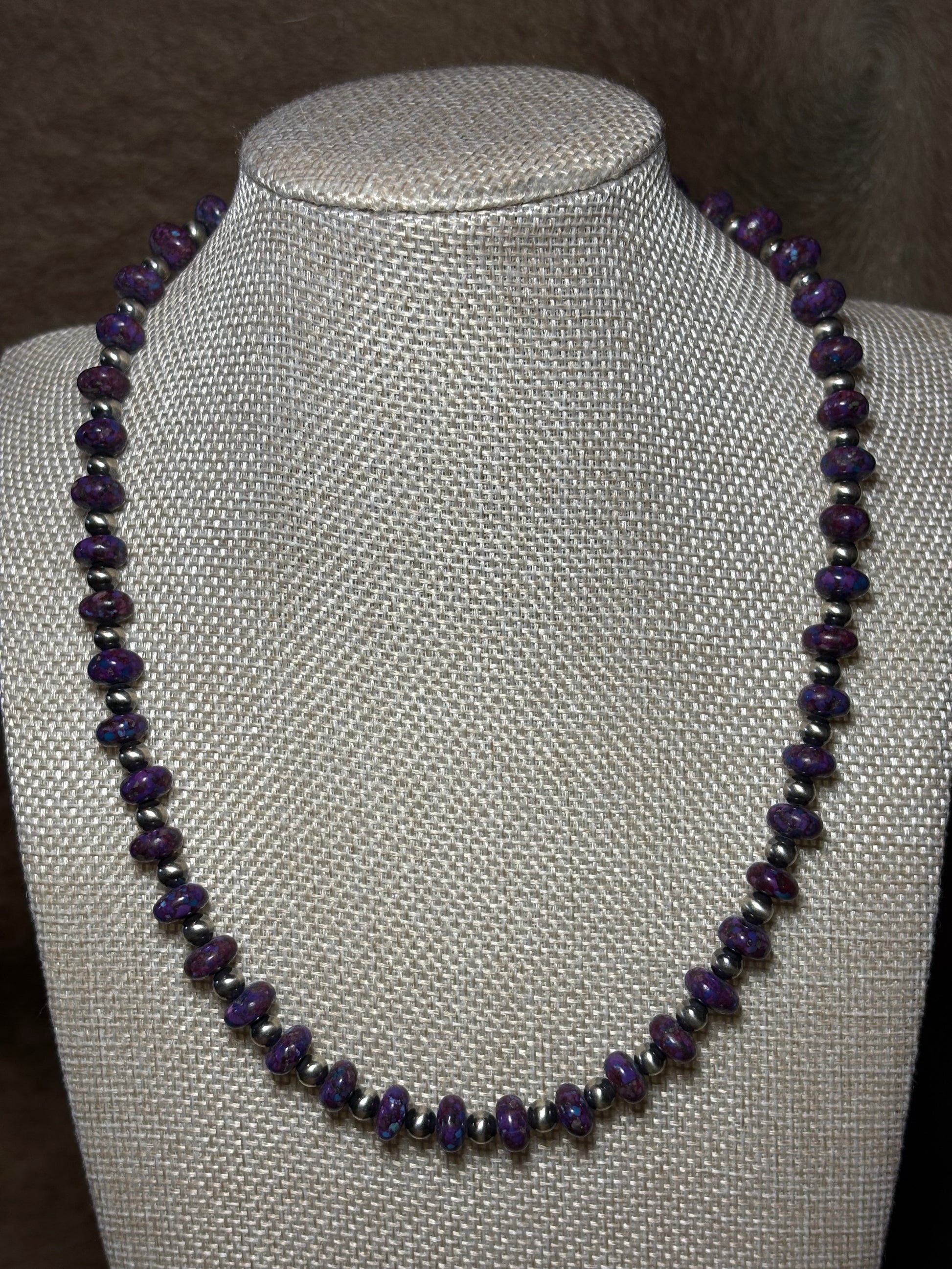 This necklace measures 18-19.5" and includes 5mm sterling pearls with purple mohave!