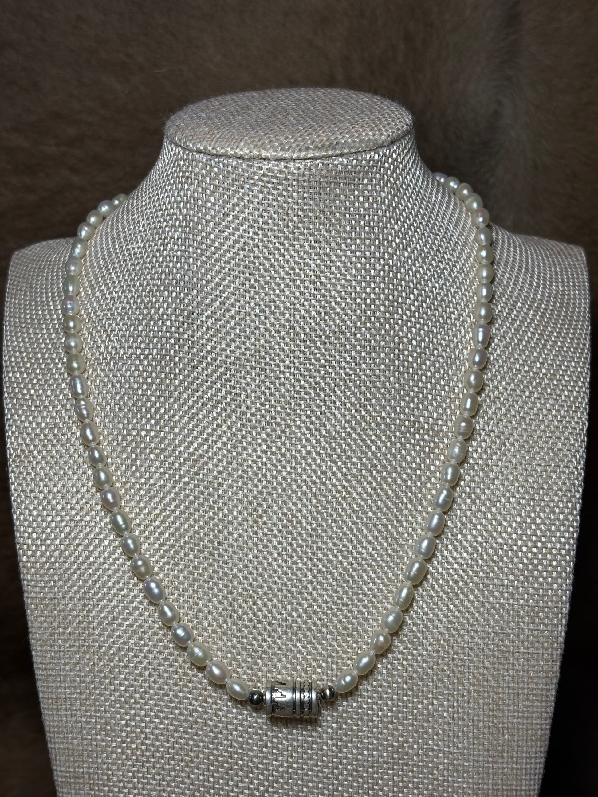 18 inch long freshwater pearl and sterling silver detail barrel bead