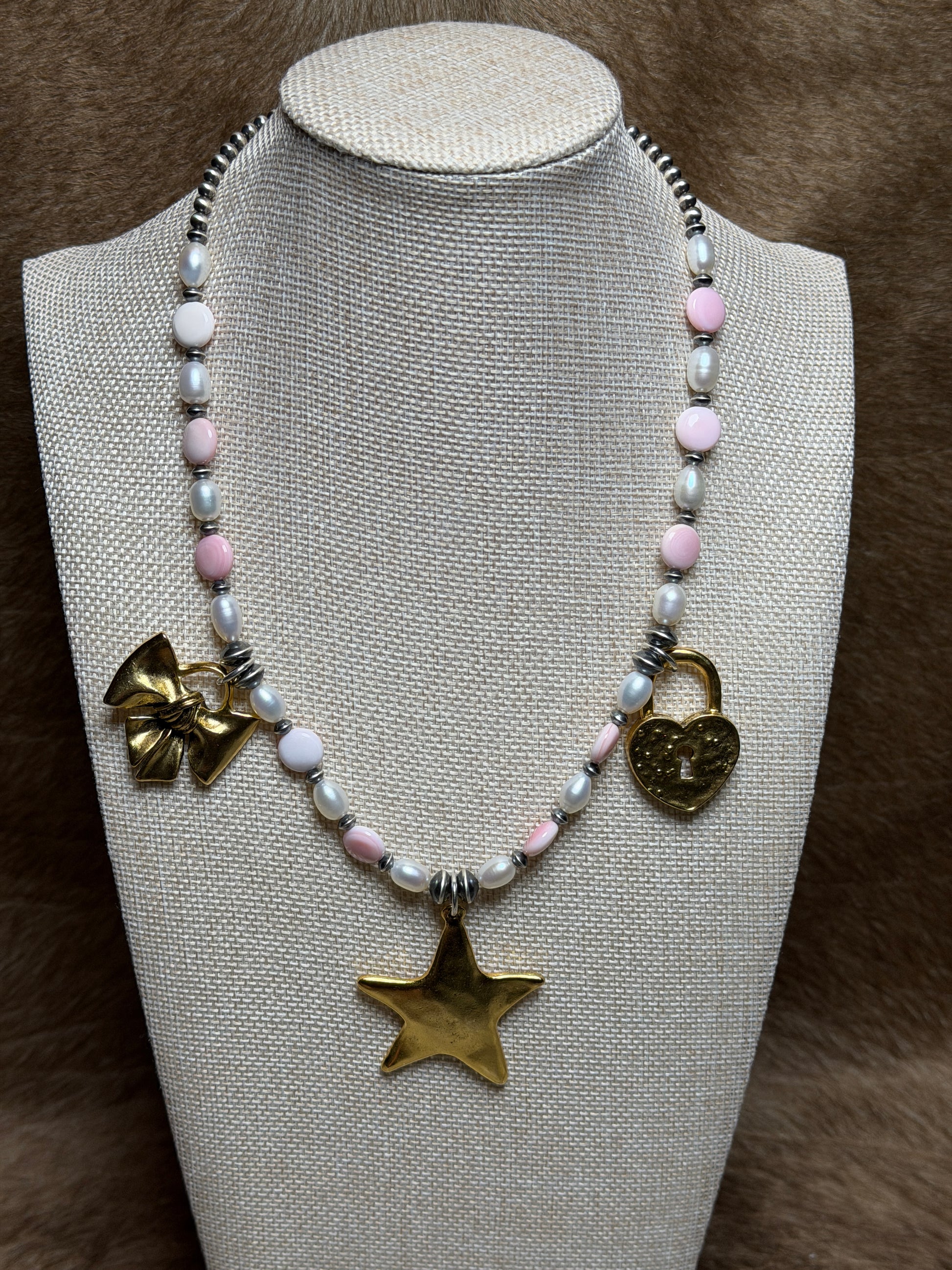 Freshwater pearl, pink conch, 4mm sterling pearl, 4mm saucer and gold plated charms