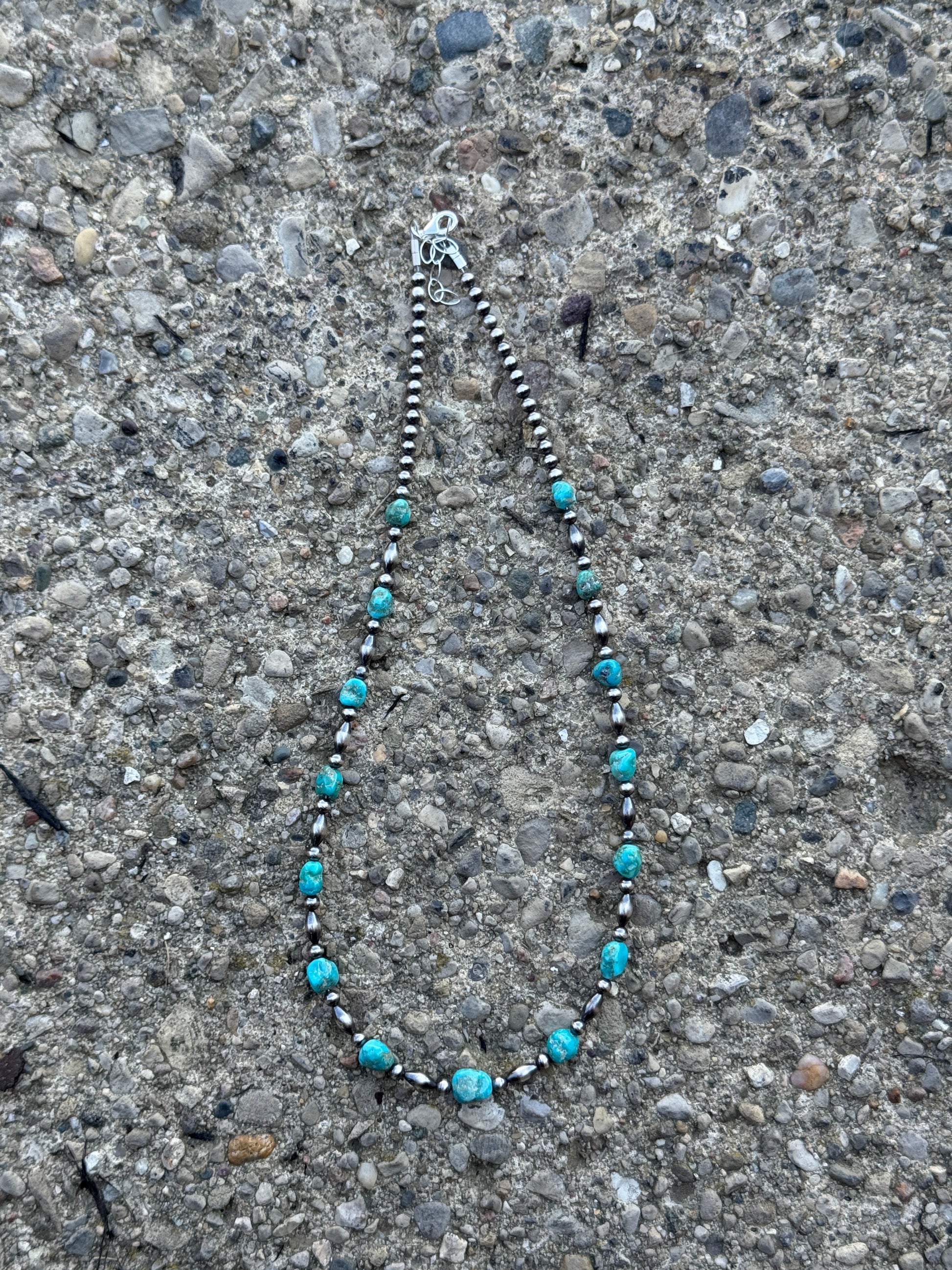 this necklace measures 19.5-21 inches long and features 4mm sterling pearl, mini torpedo and Nevada blue ridge turquoise
