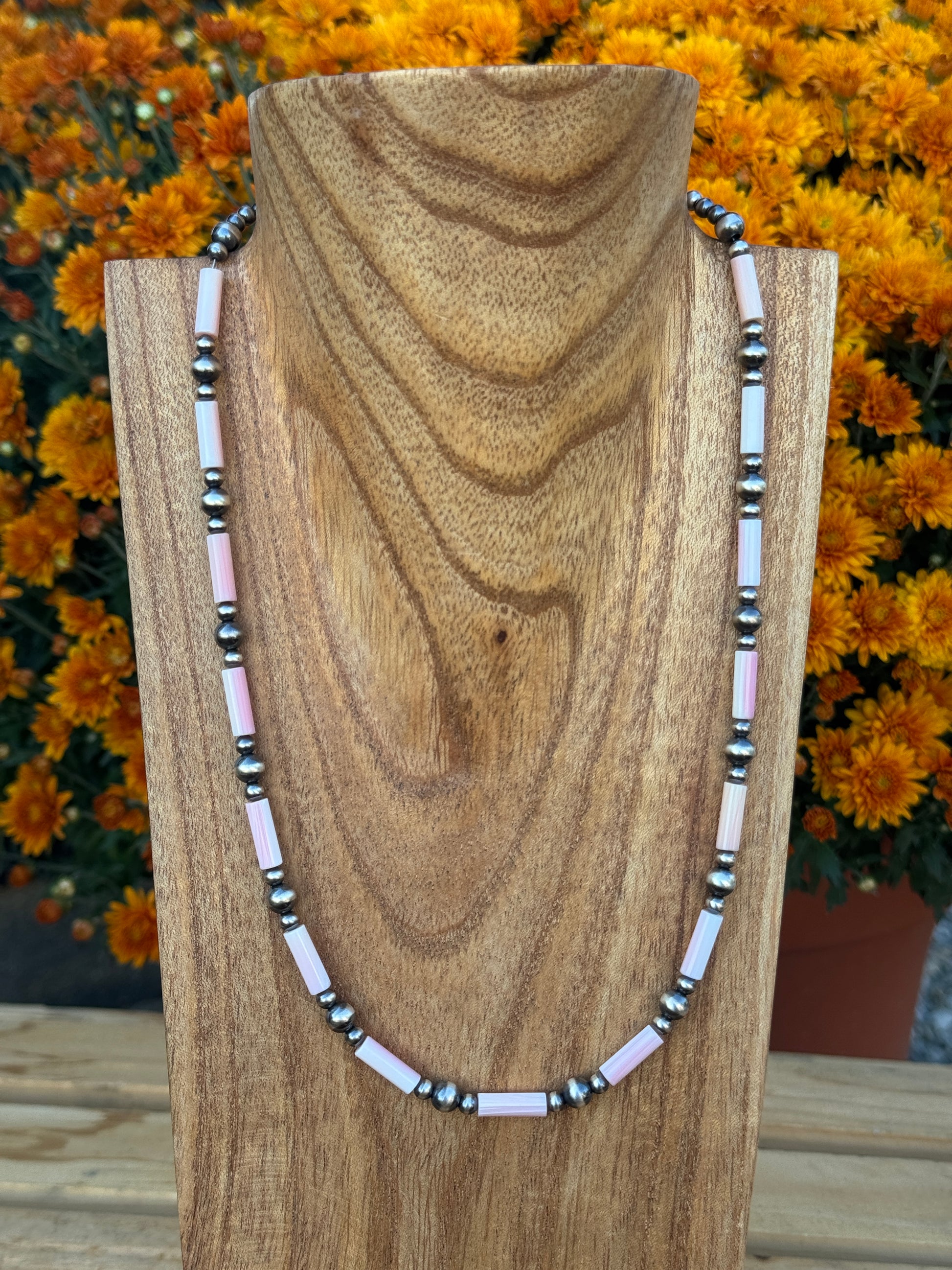 this necklace measures 20.5-22 inches long and features 4-6mm sterling pearl and pink conch