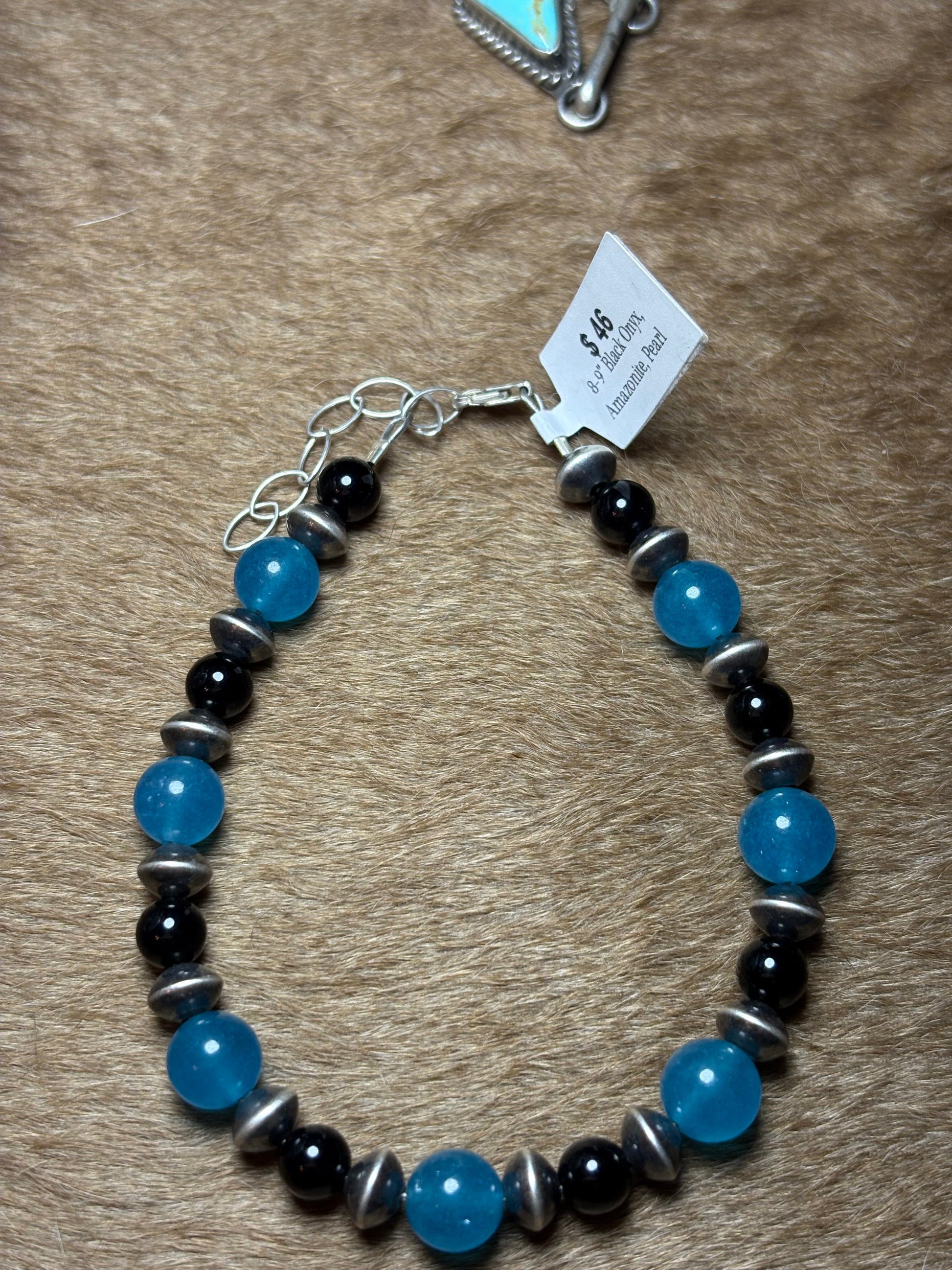 this bracelet measures 8-9 inches long and features black onyx, ammonite and 6mm sterling saucers
