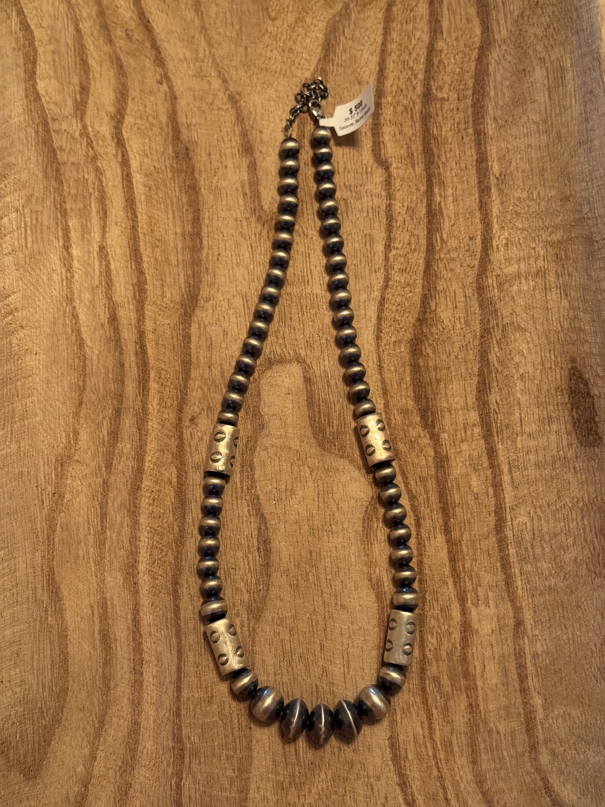 This necklace measures 20-22" and includes 8-12mm Sterling pearls, Saucers and Barrel Beads